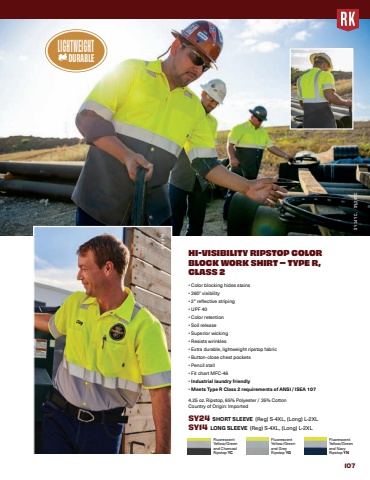 107HI-VISIBILITY RIPSTOP COLOR BLOCK WORK SHIRT %u2013 TYPE R, CLASS 2%u2022 Color blocking hides stains %u2022 360%u00b0 visibility %u2022 2\%u2022 UPF 40 %u2022 Color retention %u2022 Soil release %u2022 Superior wicking %u2022 Resists wrinkles %u2022 Extra durable, lightweight ripstop fabric %u2022 Button-close chest pockets %u2022 Pencil stall %u2022 Fit chart MFC-46 %u2022 Industrial laundry friendly%u2022 Meets Type R Class 2 requirements of ANSI / ISEA 107 4.25 oz. Ripstop, 65% Polyester / 35% CottonCountry of Origin: ImportedSY24 SHORT SLEEVE (Reg) S-4XL, (Long) L-2XLSY14 LONG SLEEVE (Reg) S-4XL, (Long) L-2XLFluorescent Yellow/Green and Charcoal Ripstop YCFluorescent Yellow/Green and Grey Ripstop YGFluorescent Yellow/Green and Navy Ripstop YNSY14YC, SY24YCSY24YGLIGHTWEIGHTDURABLE But